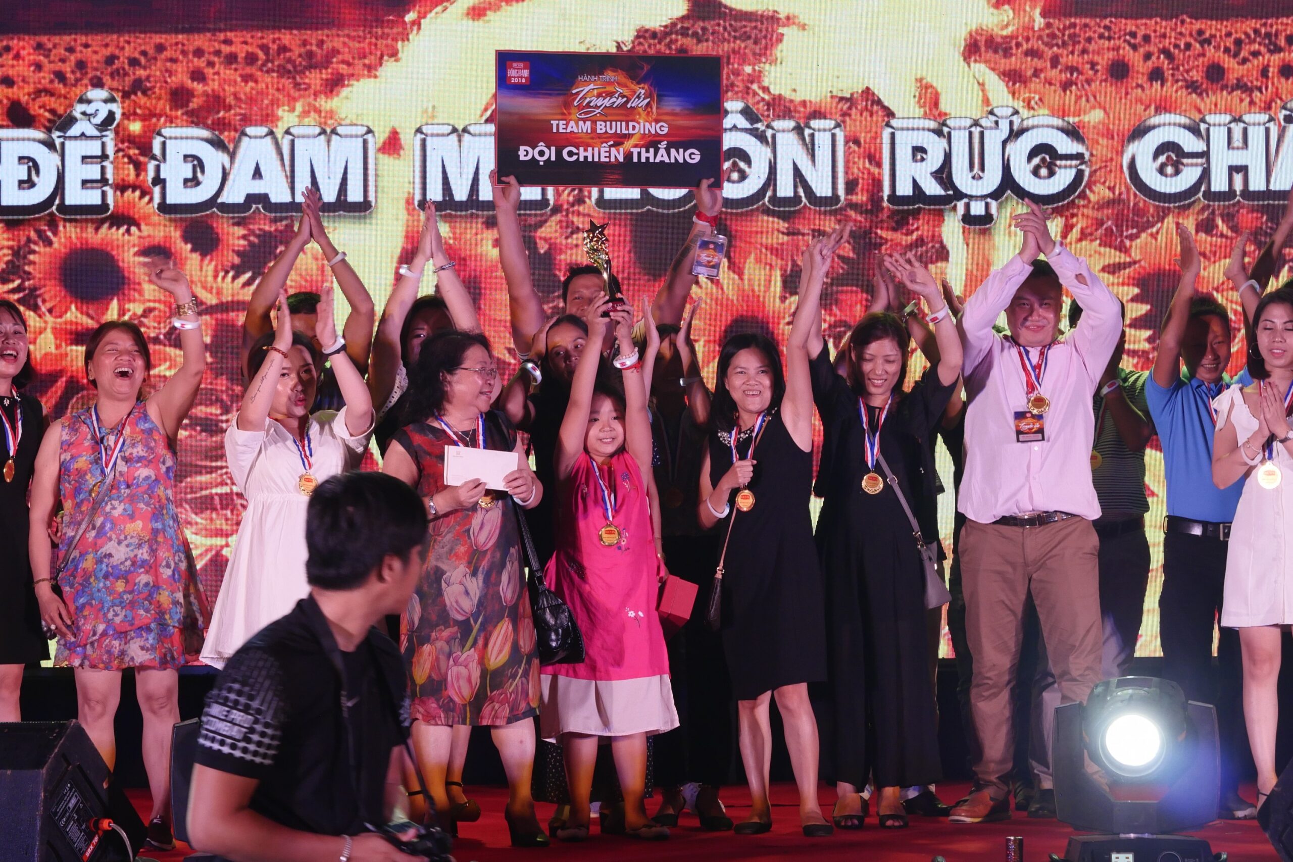 Tiếp theo đó là lễ công bố đội chiến thắng trong hoạt động team building. Sau những giây phút nín thở chờ đợi, cả hội trường như bùng nổ với những tràng pháo tay vang dội dành cho đội Cam với tên gọi “Lẩu Thập Cẩm” – đội chơi quy tụ những khách hàng tới từ cả ba miền Bắc – Trung – Nam.