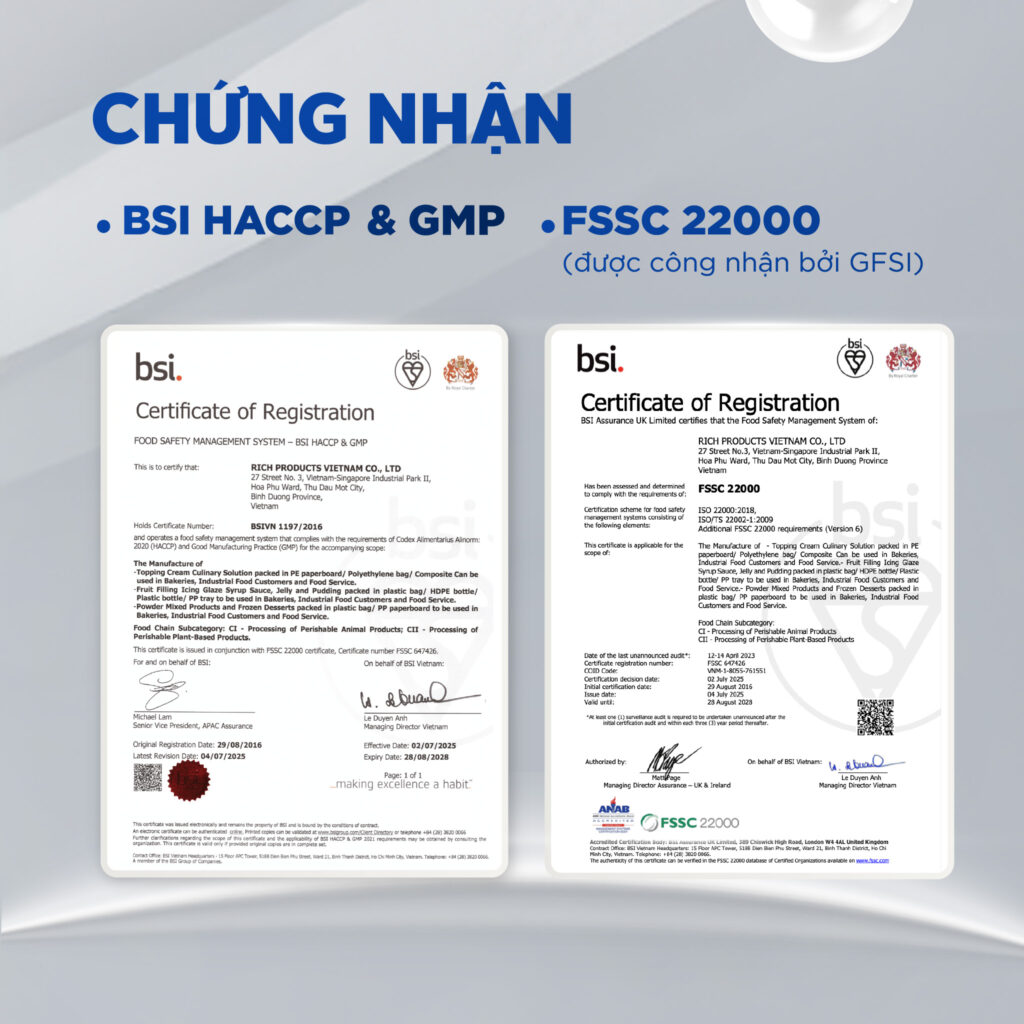 Tất cả sản phẩm đều được sản xuất theo Hệ thống quản lý an toàn thực phẩm đạt chứng nhận HACCP Codex 2020 và FSSC 22000, đảm bảo chất lượng và an toàn.
