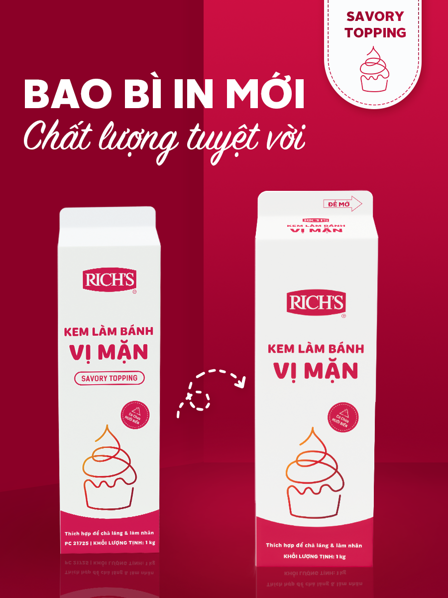 Rich’s trân trọng thông báo tới Quý Khách Hàng, Quý Đối Tác về sự thay đổi bao bì sản phẩm Kem Làm Bánh Vị Mặn Rich’s, với thiết kế và chất liệu được nâng cấp, đem đến trải nghiệm tốt hơn cho người tiêu dùng.