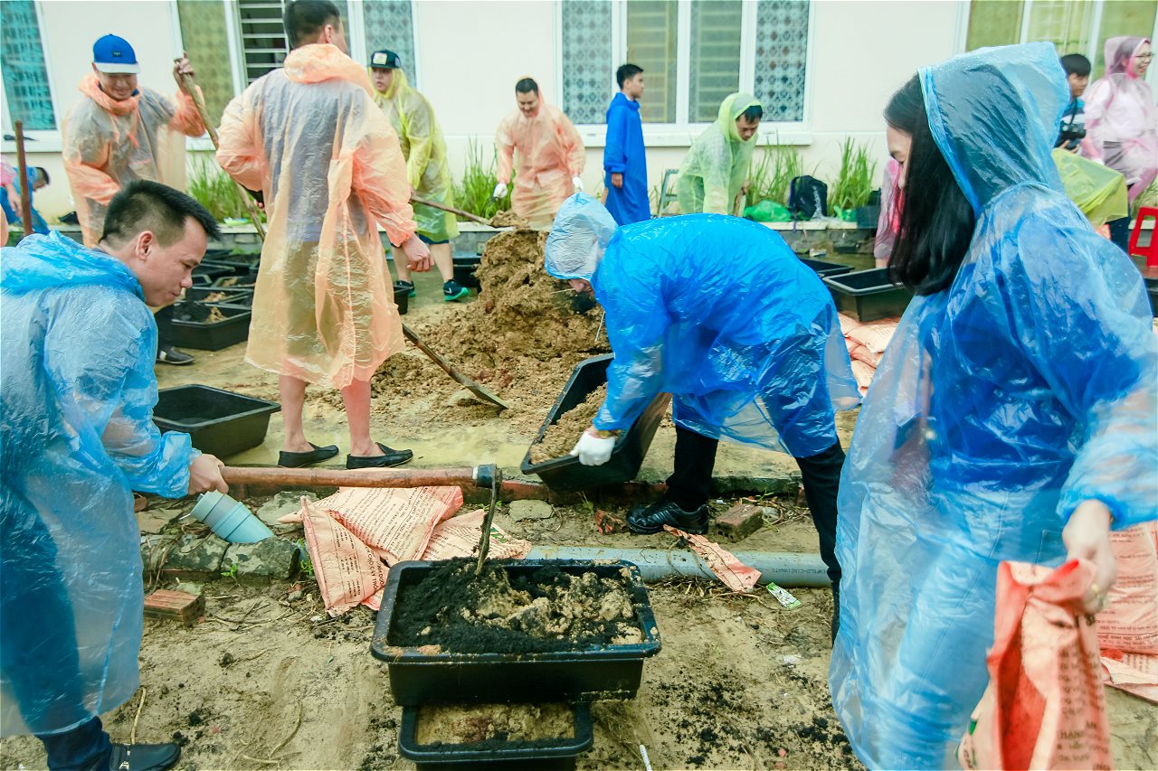 Từng đoàn người di chuyển lấy dụng cụ và tản ra thành từng nhóm. Chỉ trong chốc lát, nhóm 1 đã nhanh chóng xắn quần, mặc áo mưa và di chuyển ra vườn sau cuốc đất cho vào chậu, gieo hạt và đặt chậu lên giàn giáo.