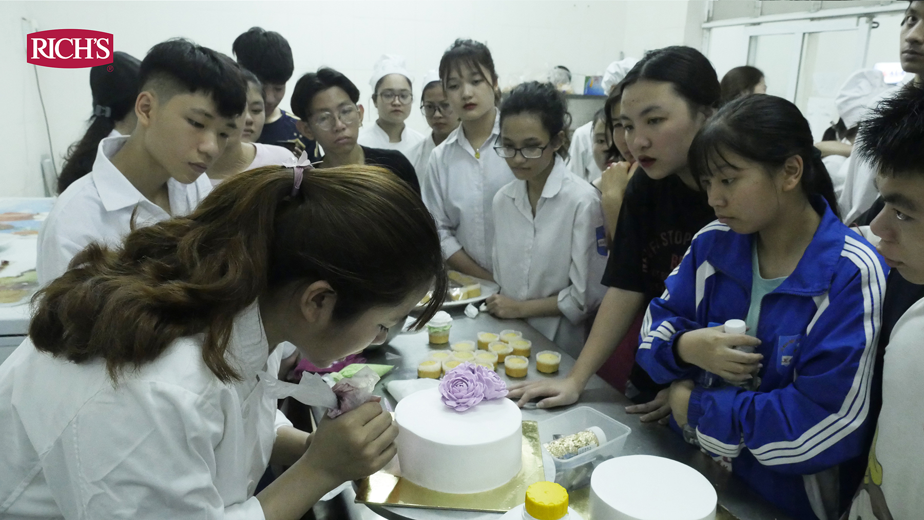 Sau khi lắng nghe những chia sẻ từ phía nhà trường và đại diện Rich Products Vietnam, các em học sinh được trải nghiệm không khí thực sự của các lớp học tại Hoa Sữa. Lớp học bánh là nơi thu hút đông học sinh nhất, tại đây các em được xem giáo viên Hoa Sữa trực tiếp đứng lớp, giảng dạy về cách bắt hoa kem, giao lưu với thầy cô và nhận những phần quà hấp dẫn từ Rich’s. Nhiều em bày tỏ sự thích thú khi được chứng kiến thầy cô tạo ra những cánh hoa sống động như thật từ Kem Trang Trí Bánh Rich’s Nhãn Vàng (Gold Label) và chia sẻ mong muốn được theo học ngành bánh. Một số em còn phân vân liệu mình không đủ khéo tay thì có thể học bánh hay không và được các thầy cô động viên: chỉ cần em chăm chỉ rèn luyện và nghiêm túc với việc học tập là có thể theo được nghề.