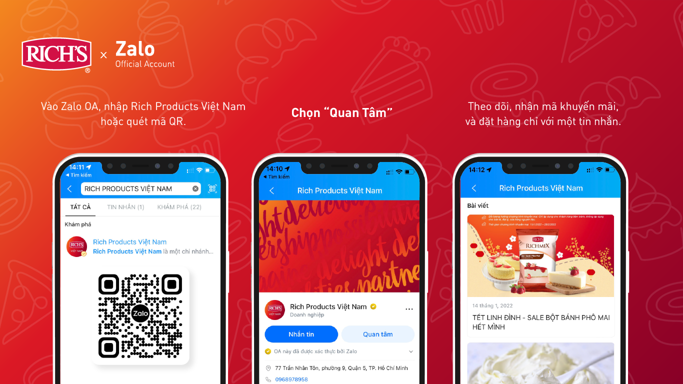 Kể từ tháng 7/2023, Rich’s Việt Nam đã triển khai hệ thống gửi thông báo tự động qua tin nhắn Zalo hoặc SMS cho các dịch vụ Chăm Sóc Khách Hàng; Cập Nhật Trạng Thái Đơn Hàng; Cập Nhật Thông Tin Sự Kiện; cũng như Giới Thiệu Các Sản Phẩm & Ứng Dụng Mới. Khi thực hiện giao dịch hoặc tương tác với Rich’s qua các hoạt động online lẫn offline, Quý khách hàng sẽ nhận được tin nhắn tự động cập nhật những thông tin liên quan. Các thông báo này sẽ giúp khách hàng dễ dàng kiểm tra chi tiết và ghi chú lưu ý quan trọng một cách chính xác nhất.