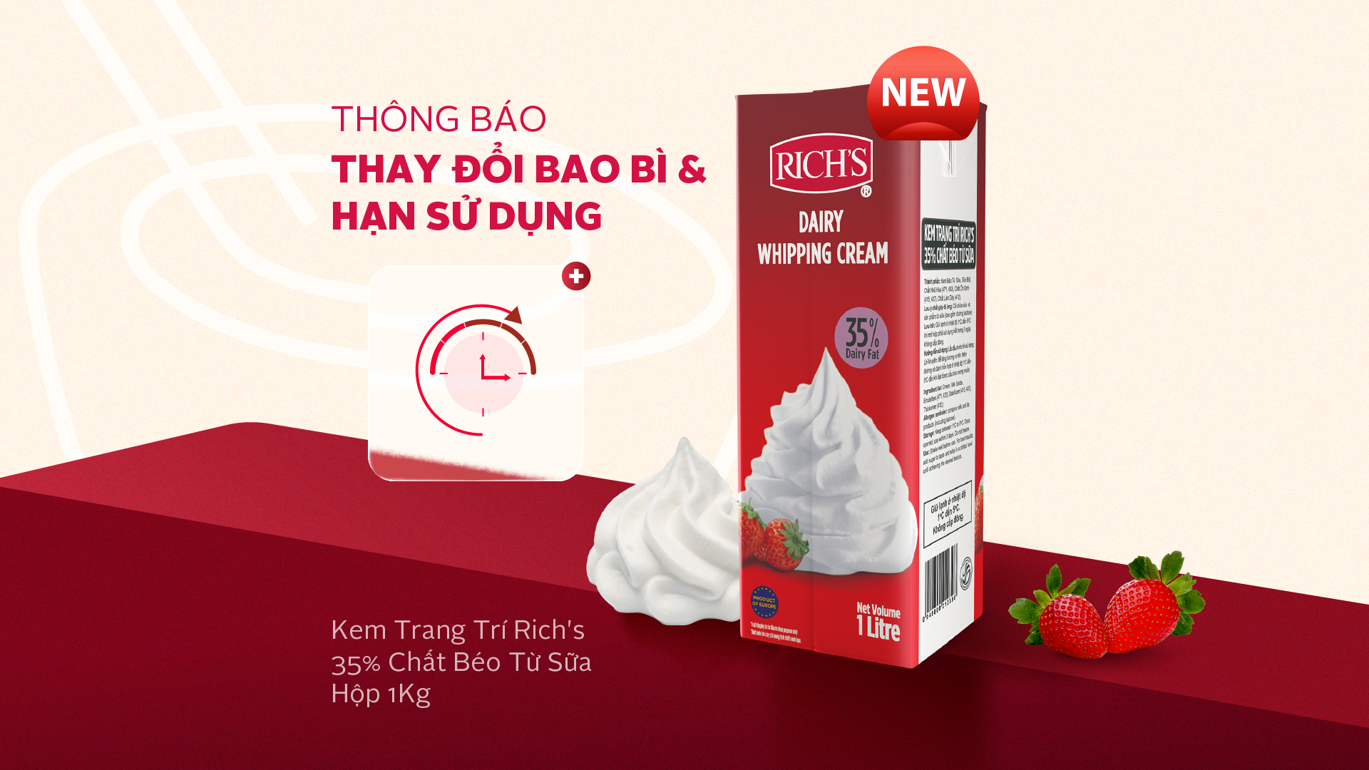 Rich Products Việt Nam xin thông báo về việc thay đổi bao bì và hạn sử dụng của sản phẩm Kem Trang Trí Rich’s 35% Chất Béo Từ Sữa (Rich’s Dairy Whipping Cream) từ ngày 01/01/2026, nội dung cụ thể như sau: